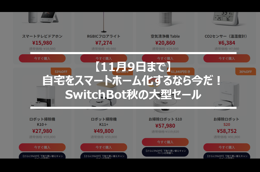 そして今、自宅をスマートホーム化している人の中で知らない人はいない「SwitchBot」が11月9日までの期間限定で秋の大型セールを開催しています。